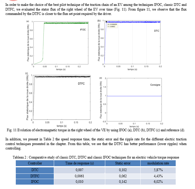 Nasri et al proposed a new control algorithm of one wheel motor based on backstepping control approach to control independently each in wheel induction motors [7]. Furthermore, the previous authors have not presented a comparative study of EV control techniques. In this article, we compare IFOC, DTC and DTFC steering techniques on a 4-wheel vehicle including 2 front wheel drives in order to identify the best steering technique. The structure of the paper is as follows : section 2 presents the physical description and mathematical modelling of EV with control. Comparative study of electric traction control technique of EV is presented in section 3. The concluding remarks and future work are given in section.