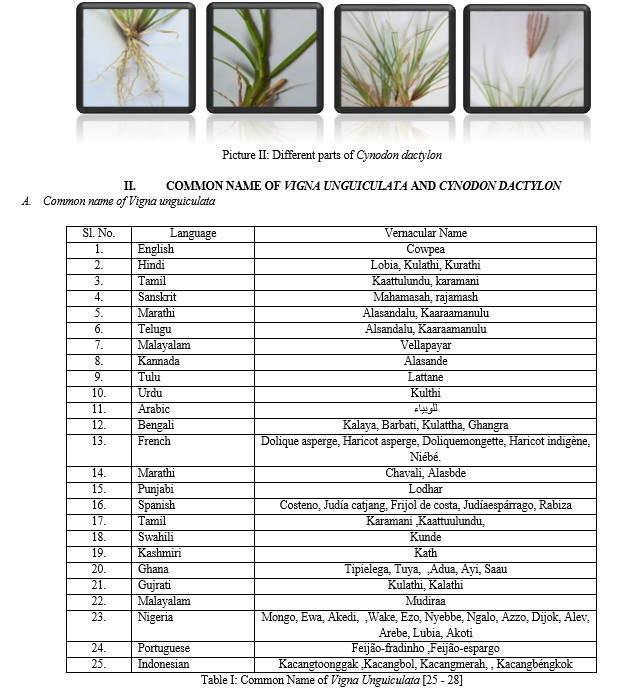 [1] Nweke, K. World literature on cowpea (Vigna unguiculata (L.) Walp). Annals of Library Science and Documentation; 1988; 35(1): 26-31. [2] Ogunlade I, Ogunleye R T, Osasona I. Chemical Composition, Antioxidant Capacity and Total Phenolic Content of the Flours Obtained from Cow Pea (Vigna ungualata) Varieties Commonly Consumed in Nigeria; 2014; 5. [3] Bejarano A, Ramírez-Bahena M H, Velázquez E, Peix A. Vigna unguiculata is nodulated in Spain by endosymbionts of Genisteae legumes and by a new symbiovar (vignae) of the genus Bradyrhizobium. Systematic and Applied Microbiology; 2014; 37(7): 533-540. [4] Segura-Campos M R, Chel-Guerrero L A, Betancur-Ancona D A. Purification of angiotensin-I converting enzyme inhibitory peptides from a cowpea (Vigna unguiculata) enzymatic hydrolysate. Process Biochemistry; 2011; 46(4): 864-872. [5] Agugo U A, Okere T O, Anya K M. Investigating the nutrient composition and anti-nutritional factors of Akidi (Vigna unguiculata), IOSR; 2013; 5(4): 3235. [6] Gupta N et al. Phytochemical evaluation of Moth Bean (Vigna aconitifolia L.) seeds and their divergence. Biochemistry Research International; 2016; 6. [7] Ibrahim S et al. Pharmacological activities of Vigna unguiculata (L) Walp: A review. International Journal of Pharma and Chemical Research; 2017; 3(1): 44-49. [8] Siddhuraju P., Becker K. The antioxidant and free radical scavenging activities of processed Vigna Unguiculata (L) Walp seed extracts.Food Chem; 2007; 101(1):10-9. [9] Boukar, O. et al., “Cowpea”, in: De Ron, A.M. (ed.), Grain Legumes, Series Handbook of Plant Breeding, Springer-Verlag, New York, 2015; pp. 219-250. [10] Barnard, E.A. Ribonucleases. Annual review of biochemistry, 1969; 38(1), 677-732. [11] Can M, Kaymak G, Sahin M., Acar Z., Ayan I. Chapter 4 Forage Cowpea (Vigna Unguiculata L. Walp) 2021 [12] Chakraborty S, Pal R, Bhattacharya S, Mandal C, Bhattacharjee A; A Short Review on Vigna unguiculata: A God Gifted Plant in Management of Sickling of Red Blood Cell and Thrombolysis; IJCRT; 2022; 10(7) : d406 - d413 [13] Nagori BP, Renu S; Cynodon dactylon (L.) Pers.; a Valuable Medicinal Plant; Research Journal of Medicinal Plant; 2011; 5(5): 508-514; [14] Shendye NV, Gurav SS; Cynodon dactylon: A Systemic Review of Pharmacognosy, Phytochemistry and Pharmacology; Int J Pharm Pharm Sci; 2014; 6(8): 7-12. [15] Animesh DK, Rita P, Aninda M; An updated overview on Cynodon dactylon (L) Pers.; Int J res Ayuerveda Pharm; 2012; 3(1): 11-14. [16] Rai PK, Rai NK, Rai AK, Watal G; Role of LIBS in elemental analysis of Psidium guajava responsible for glycemic potential; Inst Sci Tech; 2007; 35: 507-522. [17] Dhar ML, Dhwan JT, Melhorta M; Screening of Indian Plants For Biological activity; Ind J exp Biol; 1968; 6(4): 232-247. [18] Chopra RN, Nayer SL, Chopra IC; CSIR, New Delhi: Publication and Information Directorte; J Glossary of Indian Medicinal plants; 1999-88. [19] Ghosh N.C. Comparative Materia Medica. Hannemann Pub., Co. Pvt. Ltd.; 1998; pp: 855. [20] Oudhia P, Joshi BS, Kosta VK; The possibilities of preparing homeopathic drugs from the obnoxious weeds of Chhattisgarh; Bhartiya Krishi Anusandhan Patrika; 1998; 13: 53- 57. [21] Kaup SR, Nayantara AK, Bernhardt LK, Vasavi RG, Shetty SS, Pai SR; Arun KB; Antihyperlipidemic activity of Cynodon dactylon extract in high-cholesterol diet fed Wistar rats; J Genom Med Biom Health Sci; 2011; 3(3-4): 98-102. [22] Chandra MD, Shama S, Satish C; Overview of Cynodont dactylon in modern medicine as antidiabetic herb; Journal of drug delivery &Theraputics; 2013, 3(6), 117-120. [23] Kritikar, KR, Basu BD; 1980; Indian medicinal Plants, 2nd Edn.; International book distributors, Dehradun; pp. 2650. [24] Mandal C, Chakraborty S, Bhattacharya S, Pal R, Bhattacharjee A, A Comprehensive Review on Cynodon dactylon in Management of Diabetes & Cardiovascular Diseases; IJPRA ; 2022 ; 7(4) : 624 -633. [25] Singh A et al. Review on standardization and phytochemical of Vigna unguiculata. International Journal for Pharmaceutical Research Scholars. 2015; 4(2):506-516. [26] Heuzé V, Tran G. Cowpea (Vigna unguiculata) seeds. Feedipedia, a programme by INRA, CIRAD, AFZ and FAO, 2015. [27] Gupta N et al. Phytochemical evaluation of Moth Bean (Vigna aconitifolia L.) seeds and their divergence. Biochemistry Research International; 2016; 6. [28] Ashraduzzaman M et al. Vigna unguiculata Linn. Walp. seed oil exhibiting antidiabetic effects in alloxan induced diabetic rats. Malaysian Journal of Pharmaceutical Sciences. 2011; 9(1):13-23. [29] Asthana A, Anil K, Sumit G and Jyotsna D. Pharmacological perspectives of Cynodondactylon. Res. J. Pharma. Biol. Chem. Sci. 2012; 3(2):1135-1147. [30] Chandra MD and Chandra SS; overview of cynodont dactylon in modern medicine as antidiabetic herb; Journal of drug delivery &Theraputics; 2013, 3(6), 117-120. [31] Singh SK, Rai PK, Mehta S, Gupta RK and Watal G. Curative effect of Cynodon dactylon against STZ induced hepatic injury in diabetic rats. Ind. J. Clin. Biochem. 2009; 24:410-413 [32] Sathe, SK. and Venkatachalam M. Fractionation and biochemical characterization of moth bean (Vigna aconitifolia) proteins. LWT-Food Science and Technology. 2007; 40(4), 600-610. [33] Ibrahim S et al. Pharmacological activities of Vigna unguiculata (L) Walp: A review. International Journal of Pharma and Chemical Research. 2017; 3(1):44-49. [34] Kumar A, Sawarkar HA, Deshmukh VS, Mishra KK, Singh M, Verma T and Kashyap P.Cynodondactylon(L.) Pers: Pharmacological actions and medicinal applications. International Journal of Herbal Drug Research; 2011; I(1): 1-7. [35] Shendye NV and Shailendra S.,Cynodondactylon: A systemic review of pharmacognosy, phytochemistry and pharmacology; International Journal of Pharmacy and Pharmaceutical Sciences; 2014, 6(8), 7-12 [36] Chandra Mukesh D., Shamashilpand Satish Chandra.; overview of cynodont dactylon in modern medicine as antidiabetic herb; Journal of drug delivery &Theraputics; 2013, 3(6) : 117-120 [37] Onwuliri V
