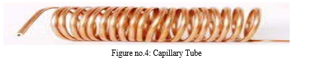 c. Capillary Tube: One of the most often utilised throttling mechanisms in air conditioning and refrigeration systems is the capillary tube. The capillary tube is a copper tube that has a very small internal diameter, a very long length, and is wound around itself numerous times to take up less room. Domestic air conditioners, deep freezers, water coolers, and refrigerators all employ capillary tubes as throttling devices.Specifications of capillary tube Size (mm) 0.79- 1.12