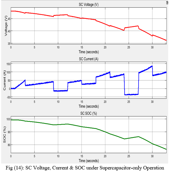 The initial SOC of supercapacitor is 99.3 % and for a simulation time of 33 seconds, the final SOC is 76.3 % as shown in Fig (14). It shows the inherit feature of supercapacitor that it discharges faster than battery. The max. Current supplied by the supercapacitor is 138.8 A. Max. Regenerative current observed is -38.33 A which means more recovery than battery.