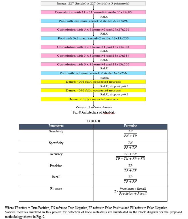 AlexNet is popular CNN architecture that has been used for image classification tasks. It is 8 layers deep. The network is composed of multiple convolutional and pooling layers that learn the features of the input images. Architecture of AlexNet is shown in Fig. 8. The features learned by the CNN can then be used for classification tasks. Performance evaluation of this model is done using Sensitivity, Specificity, Accuracy, and F1-score as evaluation criteria. These parameters are formulated in TABLE II.