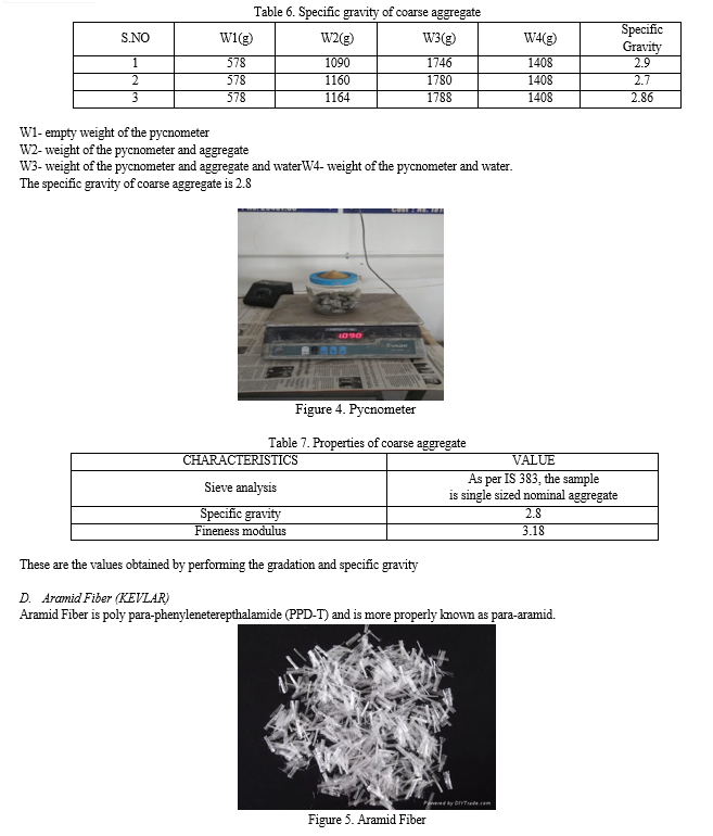 This chapter deals with various materials used like cement, fine aggregate, coarse aggregate, Aramid Fiber and water. The properties and functions of these materials are described in this chapter.