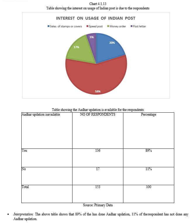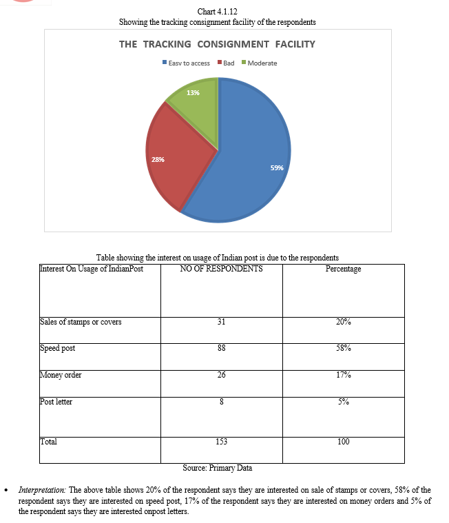 A. Findings ? 35% of the respondents are for the age groups of 31-50 years ? 65% of the respondents are male. ? 43% of the respondents are working in professionals. ? 35% of the respondents are for the monthly in income of below 15000. ? 50% of the respondents member in the family are 4. ? 52% of the respondents are married. ? 64% of the respondents are from rural areas. ? 44% of the respondents get to know about the Indian post office through relatives. ? 76% of the respondents visited the nearby post office. ? 54% of the respondents 1-3 days Indian postal service takes deliver. ? 63% of the respondents have used the Indian post office few months back. ? 59% of the respondents are tracking consignment facilities are easy to access. ? 58% of the respondents are the reason the use Indian post for speed post. ? 89% of the respondents found Aadhar updation is available in Indian post. ? 57% of the respondents feels that service work are inactive. ? 51% of the respondents are need to improve nearby postal service. ? 81% of the respondents agreed the risk free for using post office account. ? 63% of the respondents personally not interested for the Indian post accounts scheme. ? 61% of the respondents are not trust worthy towards Indian post government of India. ? 87% of the respondents that Indian post comes under government sectors. B. Suggestions ? Postal services are economic compared to other competitors. There is a lack of professional attitude and competitive foresight. With the adoption of modern methods of providing services to more customers can be attracted. ? To Aid the raise of revenue generation capacity. The prices should be competitive. ? India Post offers variety of services to the customers at reasonable prices. But the customers are not aware of such services. The proper Advertisements need to be made by Department of Post. ? Indian Postal Service Department has to increase the productivity of employees because a similar nature of work makes an employee irritate and less productive. ? To train the employees to develop relationships with regular clients. ? Time is precious for everyone. With this motto, the customer service department should work so that there shall not be a long queue in any counter. ? Customer Friendly environment should be there in every counter. ? To improve the delivery services with respect to time such as delivery in 24 hours even for other than local areas. ? Marketing strategies need to be implemented for retaining the existing customers and to attract the new one. ? The Department of Post need to compare their performance with the competitors and revolutionary decisions need to be implemented promptly to bring back the Glory of the India Post and to become a market leader. C. Conclusion It can be concluded that Indian Postal service needs technological, social, cultural & economic change. The status of any organization depends upon its personality, perceptions of the customers and the quality of the services offered. As regards the service quality perceptions on post offices, the positive attitude is greater than the negative attitude. Coimbatore Head post office are satisfied with their respective Specifically respondents of Coimbatore district are satisfied with the safety from crime while handling with cash, response to complaints, awareness about the services available and availability of information at the post office. Though the functions of post offices are procedural and its services are based on government norms.