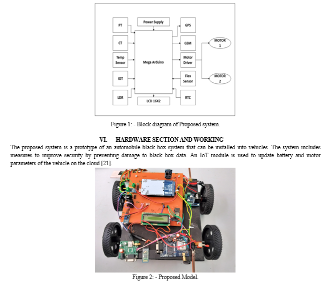 [1] Mathew et al. IoT-Based Battery Monitoring System for Electric Vehicle January 2018 International Journal of Engineering & Technology 7(4.31):505-510 DOI:10.14419/ijet. v7i4.31.25472 [2] Plett, G. L. (2004). Battery management systems for large lithium-ion battery packs. IEEE Transactions on Industrial Electronics, 51(1), 296-302. DOI: 10.1109/TIE.2004.840281. [3] Haque, M. H., & Mahmud, M. A. (2020). A review on power electronics converter topologies for electric vehicle applications. SN Applied Sciences, 2(7), 1-21. DOI: 10.1007/s42452-020-02927-9 [4] Lee, H., Kim, H., Lee, S., & Lim, H. (2019). Sensor-based state of charge estimation of lithium-ion batteries using machine learning. Energies, 12(20), 3957. DOI: 10.3390/en12203957 [5] Wang, L., & Chen, C. L. (2018). Cybersecurity of connected electric vehicles: Threats, vulnerabilities, and challenges. IEEE Transactions on Intelligent Transportation Systems, 19(8), 2470-2486. DOI: 10.1109/TITS.2018.2792292. [6] L. Arnedo, R. Burgos, D. Boroyevich, and F. Wang, ``System-level Blackbox DC-to-DC converter models,\'\' in Proc. IEEE Appl. Power Electron. Conf. Expo., Feb. 2009, pp. 1476_1481. [7] B. Lunz and D. Sauer, ``Electric Road vehicle battery charging systems and infrastructure,\'\' in Advances in Battery Technologies for Electric Vehicles, B. Scrosati, J. Garche, and W. Tillmetz, Eds. Chicago, IN, USA: Woodhead, 2015, pp. 445_467. [8] O. Kolawole and I. Al-Anbagi, ``Electric vehicles battery wear cost optimization for frequency regulation support,\'\' IEEE Access, vol. 7, pp. 130388_130398, 2019. [9] G. Guarderas, A. Frances, D. Ramirez, R. Asensi, and J. Uceda, ``Blackbox large-signal modeling of grid-connected DC-AC electronic power converters,\'\' Energies, vol. 12, no. 6, p. 989, Mar. 2019, doi: 10.3390/en12060989. [10] Abdallah Kassem, Rabih Jabr, GhadySalamouni, Ziad KhairallahMaalouf, “Vehicle Black Box System”, Proceedings of the 2nd Annual IEEE System Conference, IEEE 2008, pp. 1-6. [11] Milind Khanapurkar, Dr.Preeti Bajaj, Dakshata Gharode, “A Design Approach for Intelligent Vehicle Black Box System with Intra-vehicular communication using LIN/Flex-ray Protocols”, Proceedings of 2008 IEEE International Conference on Industrial Technology IEEE 2008, pp. 1 – 6. [12] Watthanawisuth, N., Lomas, T., and Tuantranont, A., “Wireless Black Box Using MEMS Accelerometer and GPS Tracking for Accidental Monitoring of Vehicles”, Proceedings of IEEE-EMBS International Conference on Biomedical and Health Informatics (BHI), IEEE 2012, pp. 847 – 850. [13] Narkar, T. V. (2016). Automatic dipper light control for vehicles. International Journal of Research in Engineering and Technology, 5(3), 97-101. [14] Ms. Priyanka Dubal, Mr. Nanaware J.D, ?Design of Adaptive Headlights for Automobiles? International Journal on Recent and Innovation Trends in Computing and Communication, Volume: 3 Issue: 3, pp 1599-1603, March 2015. [15] Kabalci, Y.; Kabalci, E.; Padmanaban, S.; Holm-Nielsen, J.B.; Blaabjerg, F. Internet of things applications as energy internet in smart grids and smart environments. Electronics 2019, 8, 972. [16] Yao, L.; Chen, Y.Q.; Lim, W.H. Internet of Things for Electric Vehicle: An Improved Decentralized Charging Scheme. In Proceedings of the 2015 IEEE International Conference on Data Science and Data Intensive Systems, Sydney, Australia, 11–13 December 2015; pp. 651–658. [17] Sousa, R.A.; Melendez, A.A.N.; Monteiro, V.; Afonso, J.L.; Ferreira, J.C.; Afonso, J.A. Development of an IoT system with smart charging current control for electric vehicles. In Proceedings of the IECON 2018-44th Annual Conference of the IEEE Industrial Electronics Society, Washington, DC, USA, 21–23 October 2018; pp. 4662–4667. [18] Muralikrishnan.R, “Automatic Headlight Dimmer A Prototype for Vehicles”, International Journal of Research in Engineering and Technology, Vol.3, Issue: 02, Feb-2014, pp. 85-90. [19] Mrs. Smita Desai, Vice-Principal Bharatesh College of Computer Applications Belagavi, Karnataka, Miss. Shreya Desai Electronics and Communication, Gogte Institute of Technology, Belagavi, Karnataka, “Smart vehicle automation,” IJCSMC, Vol. 6, Issue. 9, September 2017. [20] Ruhi Kiran Bajaj 1, Madhuri Rao 2, Himanshu Agrawal 3, “Internet of Things (IoT) In The Smart Automotive Sector: A Review,” J IOSR Journal of Computer Engineering (IOSR-JCE) e-ISSN: 2278-0661, p-ISSN: 2278-8727, PP 36-44. [21] G. Hayes, F. Blosser, “Motor Vehicle Crashes Claim More than a Million Lives Worldwide”, CDC Injury Center Media Relations, Press Release, April, 2004. [22] https://thingspeak.com/login?skipSSOCheck=true. [23] https://www.amazon.in/s?k=arduino+mega+amazon&adgrpid=59207975216&ext_vrnc=hi&hvadid=294132147734&hvdev=c&hvlocphy=9300381&hvnetw=g&hvqmt=e&hvrand=10118991824217675842&hvtargid=kwd-383378943077&hydadcr=25653_1900982&tag=googinhydr1-21&ref=pd_sl_7cud2o29ng_e.