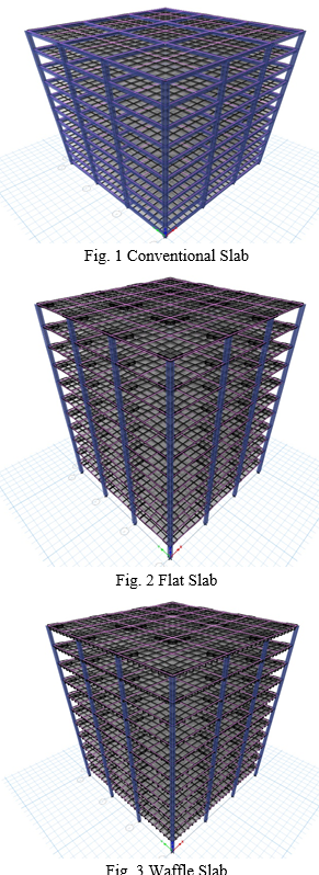 The slab is the main component of the structure. There are different types of slab used in different structure and gives better appearance to the structure. In this project, three type of slab to be used. The comparative study of Conventional slab, flat slab, and waffle slab under seismic condition to be analyzed. An effort has been made to evaluate the study between Conventional slab, flat slab, and Waffle slab for G+10 story building. This type of slab has been analyzed and designed by ETABS software. The plan of waffle slab plan is done in such a way in order to accomplish better burden dispersion. The near investigation of waffle slab with flat Slabs and conventional slab and features the benefit waffle slab have over flat Slabs and conventional slab. The parametric studies comprise maximum lateral displacement, story drift, and axial forces generated in the column due to slab.