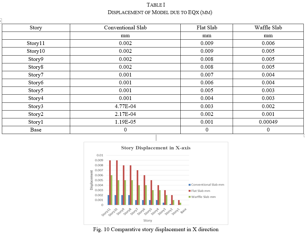 In the above graph, the displacement occurs due to earthquakes in Y-direction. The displacement of the waffle slab is more as compared to the conventional and flat slab. The maximum displacement in the waffle slab in the 11th story is 0.023mm and that of base displacement is negligible.