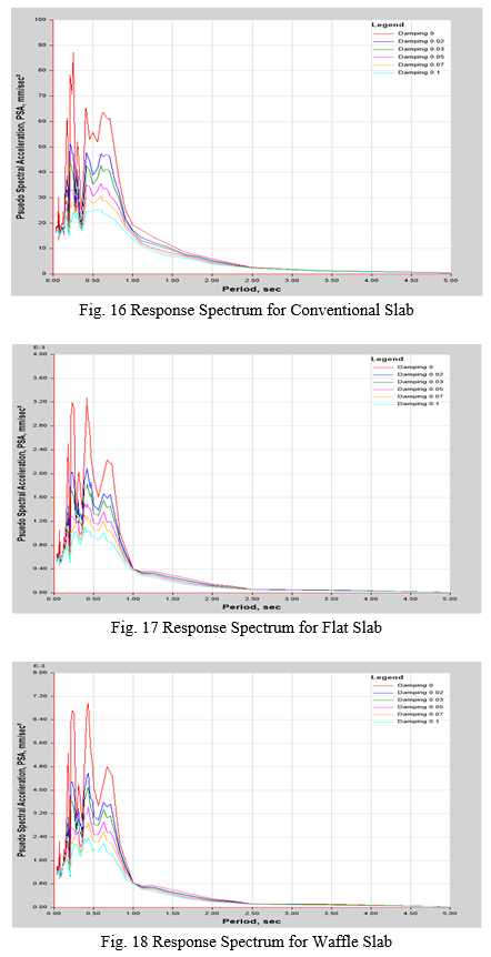 A. The top rebar intensity of the waffle slab is more as compared to the conventional slab and flat slab. B. The modal displacement in the X direction is higher in the flat slab as compared to the conventional and waffle slab. C. The modal displacement in the y-direction is increased in the waffle slab as compared to the Conventional slab and flat slab. D. The story drift in the x-direction is greater in the flat slab as compared to the conventional slab and waffle slab. E. The story drifts in the y-direction is the same in all slabs so that all structures behave in a similar manner. F. The response spectrum for various damping ratios is shown in the above graph in which at damping ratio 0 the graph increases