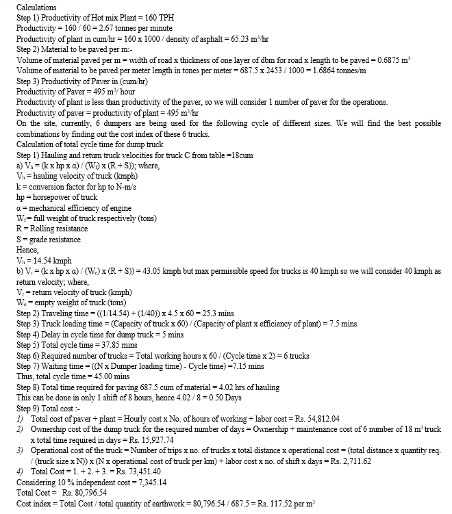 In the current case the hot mix plant is located at Pimpalwadi which can produce about 160 tons per hour. Chainage is 29.00 to 30.00 and the distance between actual site and hot mix plant was about 9 km to and fro. The project was requiring a paving individual 12.5 m lane of 1 km and 115mm thickness having a density of 2.45 tonnes/cum. The maximum speed of paver is about 15m per minute. Efficiency of Asphalt paver is 0.8 and density of 2453 kg/sq.m-m.