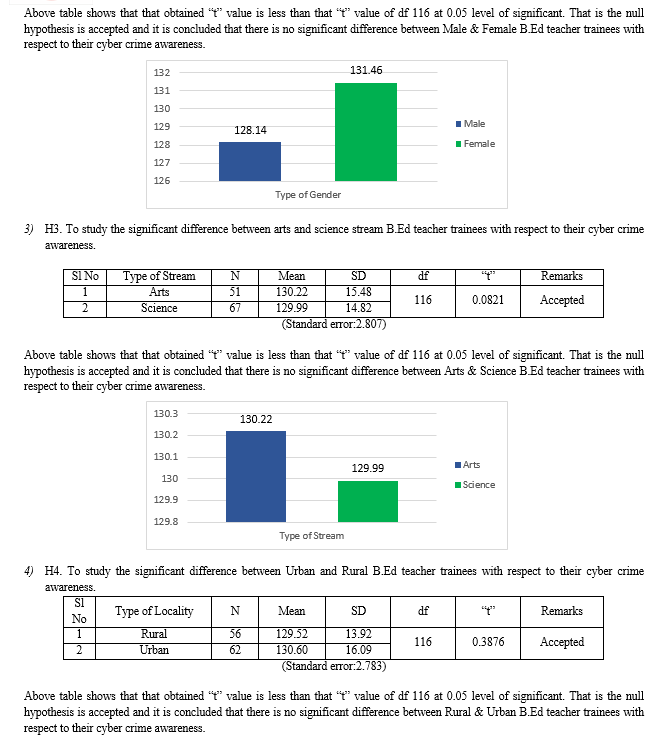 The present study useful to know about the student’s level of knowledge of cybercrime. The B.Ed student teachers can educate their students about the negative consequences of using the internet without taking adequate precautions. It is essential that B.Ed pupil teachers are aware of cybercrime in order to combat it. According to the findings, there is no significant difference between cybercrime awareness among B.Ed teacher trainees with respect to gender stream and locale. With the increase in the users of internet, the increase in cybercrimes can also be seen. There are various kinds of cybercrimes which are happening in day-to-day life. But people are not aware of all such types. Majority of the people know only about hacking and virus. They are not aware of phishing, defamation, identity theft, cyber stalking etc. It is the need of today’s world to have knowledge about these crimes which are associated with the internet. According to the findings, there is no significant difference between cybercrime awareness among B.Ed teacher trainees with respect to gender stream and locale. It is the duty of each one of us to be aware of the basic cyber security. Cyber security refers to the technologies and processes that are designed to protect computers, networks and data from unauthorized access and attacks delivered via the internet by cyber criminals. The people should be aware of the basic cyber securities.