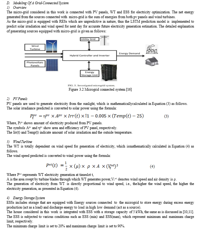 [1] M. F. Khan, M. S. Islam and S. Islam, \"Effect of Variation of Solar irradiance on the Inverter Output for a Grid connected PV system,\" 2019 International Conference on Energy and Power Engineering (ICEPE), 2019, pp.1-4, doi:10.1109/CEPE.2019. 8726568. [2] Shakya, Ayush & Michael, Semhar & Saunders, Christopher & Armstrong, Douglas & Pandey, Prakash & Chalise, Santosh & Tonkoski, Reinaldo. (2016). “Solar Irradiance Forecasting in Remote Microgrids Using Markov Switching Model. IEEE Transactions on Sustainable Energy.” PP. 1-1. 10.1109/TSTE.2016.2629974. [3] Khan, Zahoor & Zafar, Ayesha & Javaid, Sakeena & Aslam, Sheraz & Rahim, Muhammad & Javaid, Nadeem. (2019). “Hybrid meta-heuristic optimization based home energy management system in smart grid. Journa l of Ambient Intelligence and Humanized Computing.” 10. 10.1007/s12652-018-01169-y. [4] Ali, Syed Qaseem & Maqbool, S. & Ahamed, Imthias & Malik, N.H.. (2013). “Load scheduling with maximum demand and time of use pricing for microgrids.” 234-238. [5] 10.1109/GHTC-SAS6629922. [6] Rocha, H.R.O.; Honorato, I.H.; Fiorotti, R.; Celeste, W.C.; Silvestre, L.J.; Silva, [7] J.A.L. “An Artificial Intelligence based scheduling algorithm for demand-side energy management in Smart Homes.” Appl. Energy 2021, 282, 116145. [8] Kim, B.-G.; Zhang, Y.; Van Der Schaar, M.; Lee, J.-W.”Dynamic pricing and energy consumption scheduling with reinforcement learning.” IEEE Trans. Smart Grid 2015, 7, 2187–2198. [9] Shirazi, E.; Jadid, S. “Cost reduction and peak shaving through domestic load shifting and DERs.” Energy 2017, 124, 146–159. [10] Hadjout, Dalil & Torres, José & Troncoso, Alicia & Sebaa, Abderrazak & Martínez- [11] Álvarez, Francisco. (2021). “Electricity consumption forecasting based on ensemble deep learning with application to the Algerian market. Energy.” 243. 123060. 10.1016/j.energy.2021. 123060. [12] Khan, Muhammad & Usman, Muhamma d & Shafiq, Zeeshan & Wadud, Zahid & Hafeez, Ghula m & Khan, Imran & Khan, Imran. (2020). “Efficient Energy Optimization Day-Ahead Energy Forecasting in Smart Grid Considering Demand Response and Microgrids.” [13] Doroudchi, Elahe & Pal, Sudip & Lehtonen, Matti & Kyyra, Jorma. (2015). “Optimizing energy cost via battery sizing in residential PV/battery systems.” 1-6. 10.1109/ISGT-Asia.2015. 7387155. [14] S.Gopinath, & Ramachandaramurthy, Vigna K. & Sanjeevikumar, P. & MIHET- POPA, Lucian & Blaabjerg, F. & Guerrero, Josep. (2017). “Grid-Tied Photovoltaic and Battery Storage Systems with Malaysian Electricity Tariff - A Review on Maximum Demand Shaving. Energies.” 10. 1-16. 10.3390/en10111884. [15] Sepp Hochreiter, Jürgen Schmidhuber; “Long Short-Term Memory. Neural Compute” 1997; 9 (8): 1735–1780. doi: https://doi.org/10.1162/neco.1997.9.8.1735 [16] Y. Bengio, P. Simard and P. Frasconi, \"Learning long-term dependencies with [17] gradient descent is difficult,\" in IEEE Transactions on Neural Networks, vol. 5, no. 2, pp. 157-166, March 1994, doi: 10. 1109/72. 279181. [18] Yu, Yunjun & Cao, Junfe i & Zhu, Jianyong. (2019). “An LSTM Short-Term Solar Irradiance Forecasting under Complicated Weather Conditions. IEEE Access.” 7. 1-1. 10.1109/ACCESS.2019. 2946057. [19] Gbemou, Shab & Tolba, Hanany & Thil, Stépha ne & Grie u, Stéphane. (2019).” Global horizontal irradiance forecasting using online sparse Gaussian process regression based on quasiperiodic kernels.” 1-6. 10.1109/EEEIC.2019.8783653. [20] Kong, Weicong & Dong, Z.Y. & Jia, Youwe i & Hill, David & Xu, Yan & Zhang, Yuan. (2017). “Short-Term Residential Load Forecasting based on LSTM Recurrent Neural Network. IEEE Transactions on Smart Grid. PP.” 1-1. 10.1109/TSG.2017.2753802. [21] Etxegarai, Garazi & López, Asier & Aginako, Naiara & Rodríguez, Fermín. (2022). “An analysis of different deep learning neura l networks for intra-hour solar irradiation forecasting to compute solar photovoltaic generators\' energy production. Energy for Sustainable Development.” 68. 1 -17. 10.1016/j.esd.2022.02. 002. [22] Akdeniz, Fikri. (1999). 20) Kaç?ranlar, S. Sakall?o?lu, S, Akdeniz, F. , Styan, G. P. H. and Werner, H. J.(1999) \"A new biased estimator in linear regression and a detailed analysis of the widely-analyzed dataset on Portland cement,\" SANKHYA: The Indian Journal of Statistics, 61 Series B,Pt. 3, 443-459 [23] Sharma , Sanjay & Kaur, Tarlochan. (2019). “Efficient solar radiation estimation using cohesive artificial neural network technique with optimal synaptic weights. Proceedings of the Institution of Mechanical Engineers Part A Journal of Power and Energy.” [24] Rasheed, Nadia & Amin, S.H.M. & Sultana, Umbrin & Bhatti, Abdul & Asghar, Mamoona. (2018). “Extension of grounding mechanism for abstract words: computational methods insights.” Artificial Intelligence Review. 50. 10.1007/s10462- 017-9608-9. [25] Brahma, B.; Wadhvani, R. “Solar Irradiance Forecasting Based on Deep Learning Methodologies and Multi-Site Data. Symmetry” 2020, 12, 1830. https://doi.org/10.3390/sym12111830.
