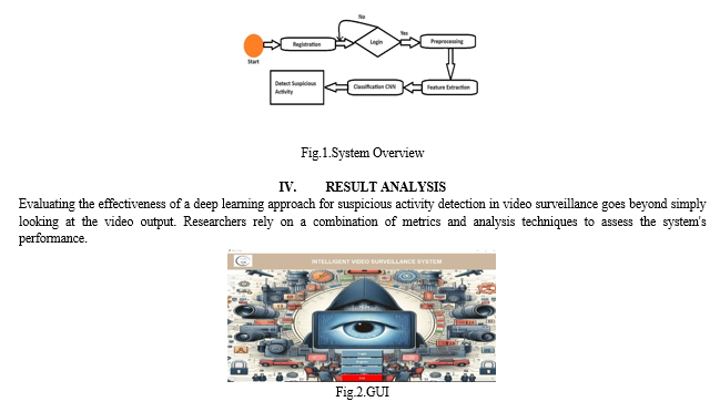 The rise of deep learning has spurred significant research in automating suspicious activity detection within video surveillance systems. This technology holds immense promise for improving security and public safety. A vast body of literature explores various deep learning architectures for this purpose. Convolutional Neural Networks (CNNs) are a popular choice due to their proficiency in extracting spatial features from video frames. Studies have investigated the effectiveness of pre-trained models like VGG-16 and YOLOv3, fine-tuned for identifying suspicious objects and human actions. Additionally, Recurrent Neural Networks (RNNs) are being explored for their ability to analyze the temporal relationships between consecutive frames, providing valuable context for understanding ongoing activities. Research is ongoing to optimize these deep learning models for specific environments and activities, with a focus on improving accuracy, reducing false alarms, and handling challenging scenarios like cluttered backgrounds or low-resolution footage.