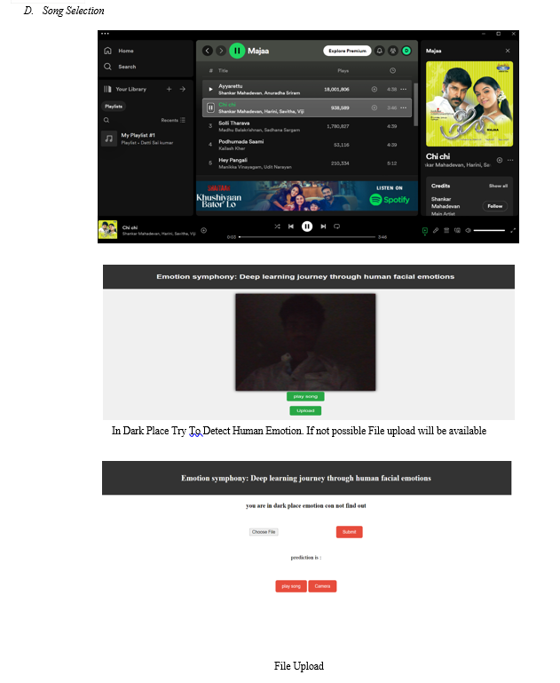 For music recommendations PYAUTOGI module are used. Our proposed system tends to reduce the computational time involved in obtaining the results and the overall cost of the designed system, thereby increasing the system’s overall accuracy. Testing of the system is done on the dataset. Facial expressions are captured using an inbuilt camera. The algorithm is designed to predict the person's emotional state based on their facial expressions and recommend music that corresponds to that emotional state. We were developed a model like recognition of facial emotions for song recommendation based on human facial emotions. If the facial recognition is not possible , then take a selfie in mobile upload in the facial recognition model. Emotions are a big part of being human. They're what make us laugh, cry, and connect with others. Imagine being able to understand these emotions just by looking at someone's face. That's what we're diving into in this journey - using deep learning to recognize human facial emotions. Deep learning is like teaching computers to learn from examples, much like how we learn from experience. By feeding computers lots of pictures of people's faces and telling them what emotions are in those faces, we can teach them to recognize emotions on their own. Faces can show a whole range of emotions, from happiness to sadness, anger to surprise, and many more. And everyone's face is different, so the computer has to be smart enough to recognize emotions across different people and cultures.