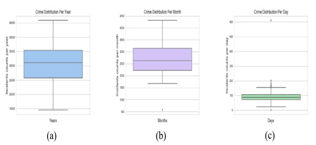 The crime dataset described in Figure 2 is distributed by year, month, and day Each year, 31624 crimes are reported in Vancouver, with 2720 crimes each month and 90 crimes every day. The dataset tends to reflect a normal distribution as the time intervals increase. The graph of each day, however, shows an unusual maximum value of 650 events, which is thought to be an anomaly - and turns out to be the Stanley Cup riot on June 15, 2011.