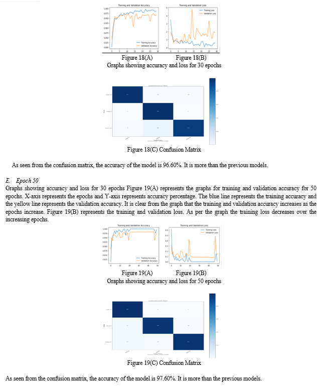 h. Plotting the Graph: With regard to epochs, the pattern of losses and accuracy in training and validation is depicted. The training process is ended and the model is saved if the training parameters and validation parameters, such as training loss, training accuracy, validation loss, and validation accuracy, do not improve as the number of epochs increases