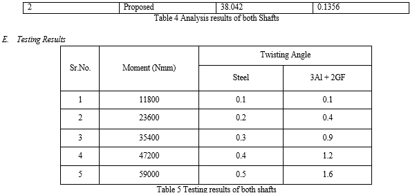 4) Composite Glass fibre shaft has less weight than conventional steel drive shaft for analyzed stress. So composites can be suggested for driving shaft of light passenger vehicle.