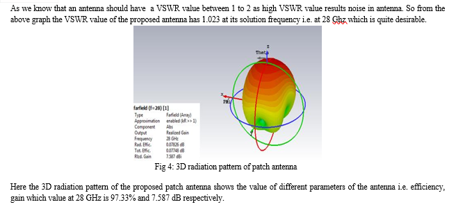 On the other side, the magnitude of VSWR is also used to quantify the reflection of the power from the antenna to the source. The simulated VSWR plot of the designed MSPA is revealed in Fig - 3. Therefore, between 27.397 GHz - 28.507 GHz, the magnitude of VSWR is less than two, which is in the acceptable range and 1.023 at 28 GHz. Another parameter that is often used to characterize the MSPA radiation pattern as drawn in Fig 4. And all the simulations are done in HFSS software with respect to the solution frequency (28 GHz). The simulated parameters which have calculated through graph are S11 i.e. return loss of the antenna, VSWR (voltage standing wave ratio, gain, directivity with respect to impedance 50 ohm. The initially calculated and optimized dimensions of the MSPA are summarized in Table1 and the simulation results are summarized in Table 2 respectively. And all the simulations are done In HFSS software with respect to the solution frequency (28 GHz).
