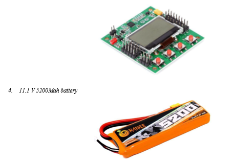 Estimation of weight of the drone is important, in-order determine the minimum thrust required to lift the drone. The weight can be spilt into drive, electronics, body and payload. The drive consists of motor, propeller, ESC and battery. The body and electronics consist of airframe, flight controller, GPS, power distribution board. In our project, the payload includes thermal module, camera controller and a transmitter. Initial estimation of weight can be seen in Table 4.1