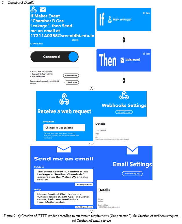 In addition, there are three IoT platforms present namely BLYNK, ThingSpeak, IFTTT. The people working in the organization i.e employees connected to the same Wi-Fi as the NodeMCU can monitor the presence of the gas in the meter, as shown in figure 10.5, by installing the BLYNK app. A notification is pushed when the concentration of the gas is above the threshold even when the app is closed. When the device containing the app has gone out of the Wi-Fi vicinity or cuts off from the Wi-Fi, a notification is pushed stating that the device has gone offline. When the gases shoot above the threshold level an email, as shown in figure 10.8, is pushed via Webhooks and the IFTTT IoT platform. The NodeMCU takes in data from sensors and posts on the ThingSpeak IoT analytics platform wherein the data is shown in a graph (Figure 10.6) and can be retrieved in excel (.csv) with the entry ID, timestamp present for every input. A similar system, as shown in figure 5.3, is created to demonstrate that data from multiple sensors, placed at various critical points, can be processed and viewed in one place without requiring the creation of separate channels for each system. The unified data is acquired from the ThingSpeak platform and is transferred to a NodeMCU which initiates the sprinkler system (relay interfaced with motor, shown in figure 5.4). The sprinkler system displays messages (figure 10.1) such as “Chamber 1 SAFE”, “Chamber 2 SAFE” and a green LED is switched on when no gases are present at the two locations. When gases are present at gas detector 1, the messages (Figure 10.3) show “Chamber 1”, “Gas Leak” and red LED, white LED are switched on. The white LED indicates that the relay is energized. Similarly, when gases are present at gas detector 2, the messages (Figure 11.3) show “Chamber 2”, “Gas Leak” and red LED, white LED is switched on. A relay is present on every microcontroller placed at the critical points. This relay operates a solenoid valve to direct the neutralizer agent, pumped by the sprinkler system, towards the point of the leak. A white LED is used to indicate the behavior of the relay. The systems are cased in a plastic compartment to give it a near product outlook conveying the compactness and definiteness.