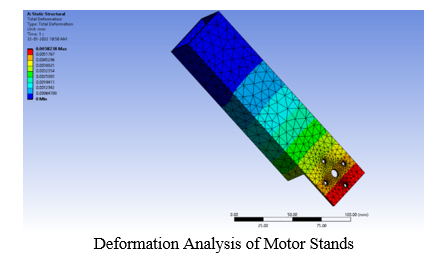 We carried out the total deformation and equivalent von mises stress analysis on the motor stands. The maximum deformation seen on the stands is 0.00582 mm and the maximum equivalent Von Mises stresses seen on the stands are 3.468 MPa.