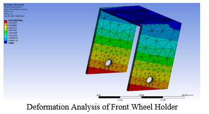 We carried out the total deformation and equivalent von mises stress analysis on the Front Wheel Holder. The maximum deformation seen on the Front Wheel Holder is 0.037 mm and the maximum equivalent Von Mises stresses seen on the Front Wheel Holder are 41.396 MPa. As we can see from the figure that the maximum deformation is at the tip of the Front Wheel Holder and there is no deformation at the other end of the Front Wheel Holder. Similarly for the equivalent Von Mises stresses we can see that the maximum stresses are developed at the holes of the Front Wheel Holder.