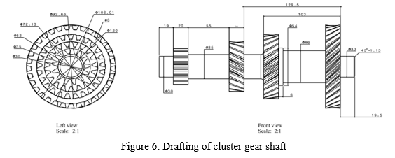 After each gear has been modelled and built, the drafting tool in the CATIA software is used to sketch each component. The dimensions of each part are shown in the drafting image. The drafting of a cluster gear shaft is shown in Figure 6.