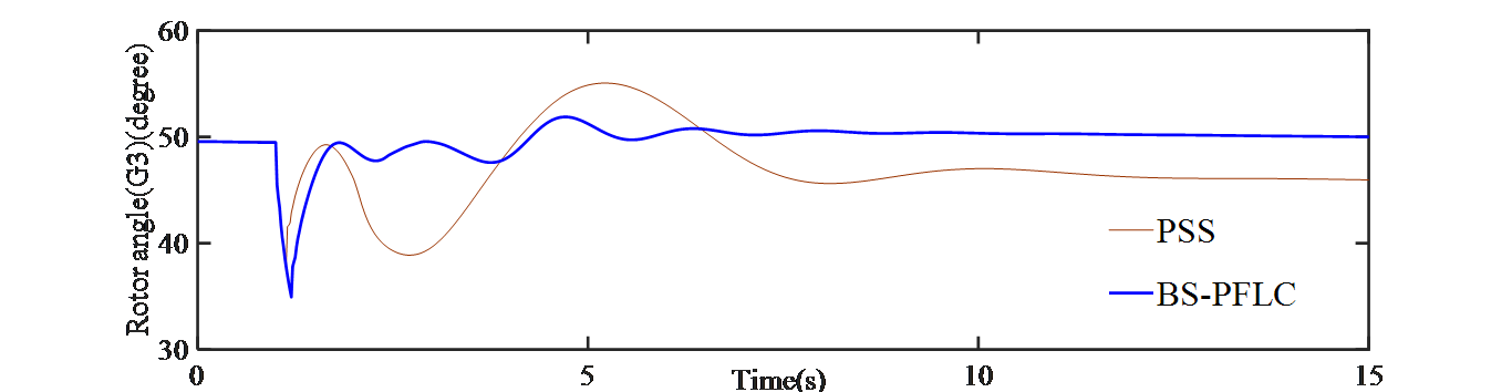For comparison purpose, the designed controller is applied at the synchronous generator-1 (SG-1) which is located on area-1 and on the synchronous generator -3 (SG-3) which is located on area-2 of Fig. 1. It is observed from Fig. 2 that, the designed BS-PFLC outperforms the conventional PSS in terms of overshoot and settling time. Again, the speed deviation of generator 1 is shown in Fig. 3(a) and for generator 3 is shown in Fig. 3(b). It is observed that the designed BS-PFLC can tackle the effect of three phase-fault in an effective manner and consequently the deviation in speed is minimized since it is very important to keep the deviation in speed zero under typical operating circumstances. The rotor angle for SG-1 and SG-3 is shown in Fig. 4(a) and Fig. 4(b) respectively. It is evident from the results that the designed hybrid controller stabilizes the rotor angle in an efficient way than that of the PSS.