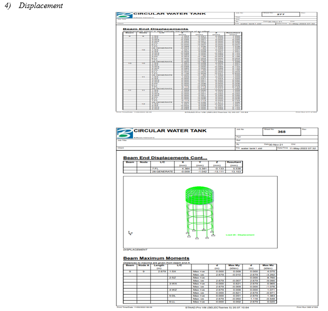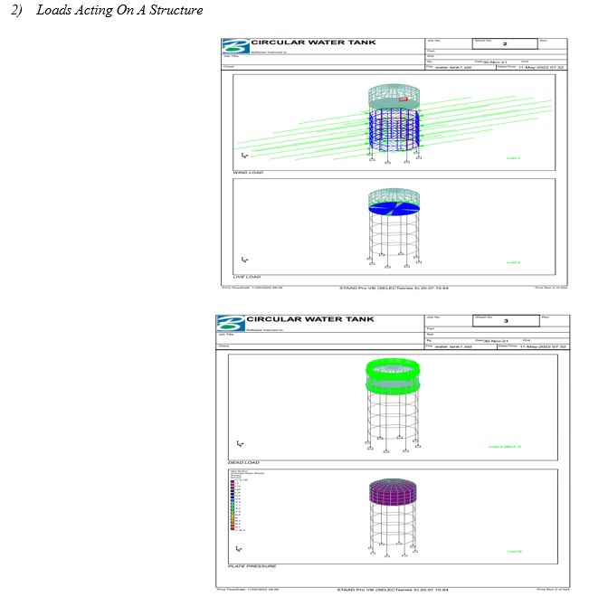 It concludes that the efficiency and reliability of the software in the field of designing is much better to that of them annual work. It has been seen that these off ware generated results were more efficient and economical which included the various different conditions under the designing conditions which are difficult to consider when done manually 1) The structural elements of water tank are safe in leakage free, flexure and shear. 2) Quantity of steel provided for structure is economical and adequate. 3) Proposed sizes of structural elements can be used in water tank as it is. 4) The design of beam, slab, column, footing and stair case are out of danger in deflection, bending, shear and other aspects. Water tanks are considered to be effusive; but they are constructed to reach present and coming time population. They are considered to highly unreasonable and safely store the portable water. Water can be distributed to number of homes, Industries and public places which means of a network of a water distribution system. Hence water tanks are considered to be supporting systems and useful for the community. In circular tanks, as height increases as side wall thickness are to be increases and roof slab and floor slab depth are decreases. The circular water tanks are economical for average capacities. Design of water tank is a very irksome method. Particularly design of underground water tanks are lots of mathematical formulae and calculation. It is also more time consuming.