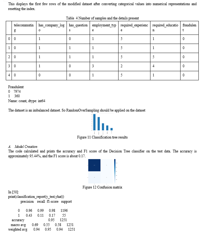 To prepare textual data for analysis, text preprocessing techniques are employed. This involves the transformation of job descriptions, requirements, and other text-based information into a format amenable to natural language processing (NLP). Techniques such as tokenization, stop-word removal, stemming, and vectorization are applied to facilitate meaningful feature extraction from textual data. A paramount concern in fraud detection is class imbalance, as fraudulent job postings often represent a minority class. To mitigate this issue, various resampling techniques are employed. Oversampling of the minority class and under sampling of the majority class are strategies employed to balance class representation and enhance model performance.