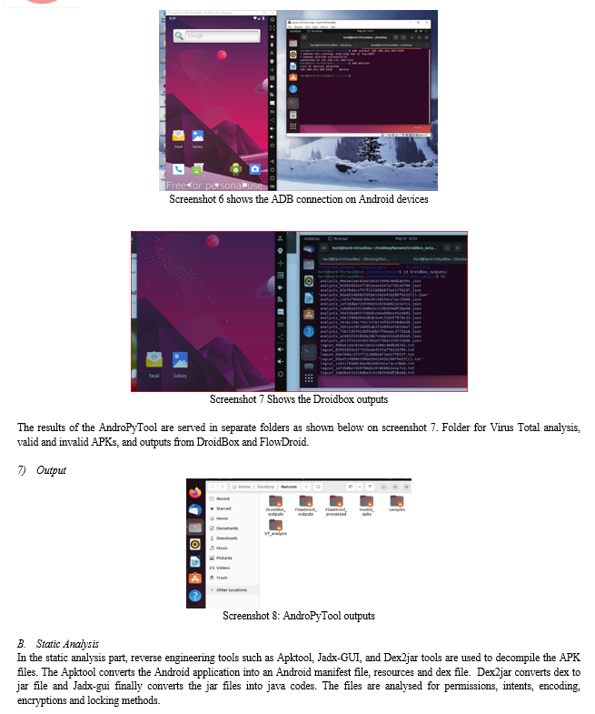 Dynamic analysis is carried out to set off the application's behaviour. The dynamic analysis malware detection includes network traffic, memory and registry utilization, instruction traces, and API call traces. CrowDroid, TaintDroid, ParanoidAndroid, Aurasium, DroidBox, and DriodScope are the tools that are for dynamic analysis [10], [11]. Android emulators, debuggers, and network analysers, are needed to observe file actions and interactions. Android Studio and Genymotion are the Android emulators used the simulate real phones [12]. The emulator instance is connected using ADB Android Debug Bridge. The DroidBox comes with Monkey Runner, which is used to emulate random UI interactions. Then record the resulting system calls using the monitoring tool strace. The strace tool monitors and tampers with interactions between processes and the Linux kernel, which include system calls, signal deliveries, and changes in process state.