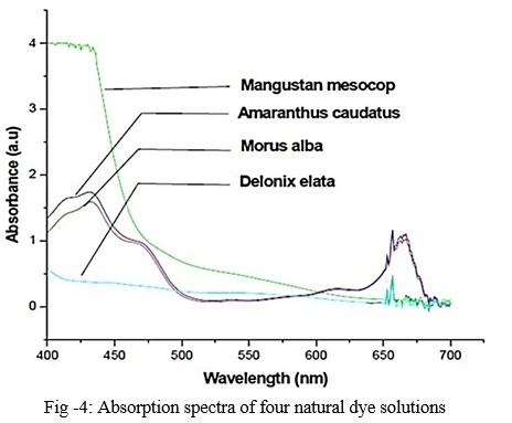 Fig.4 four organic plant extracts from morus alba, mangustan mesocop, amaranthus caudatus as well as delonix elata at wavelengths between 400 nm 700 nm are revealed on the UV-VIS absorption spectrum.The chart above clearly showed that for amaranthus caudatus and morus alba extracts, two absorbent maximums vary with the wave length of λ = 430 nm and λ = 670 nm with the intensity of the absorption. It also stated that in mangustan mesocop at 410 nm there is only one absorption peak. The absorption peaks were not discovered in the case of delonix elata.