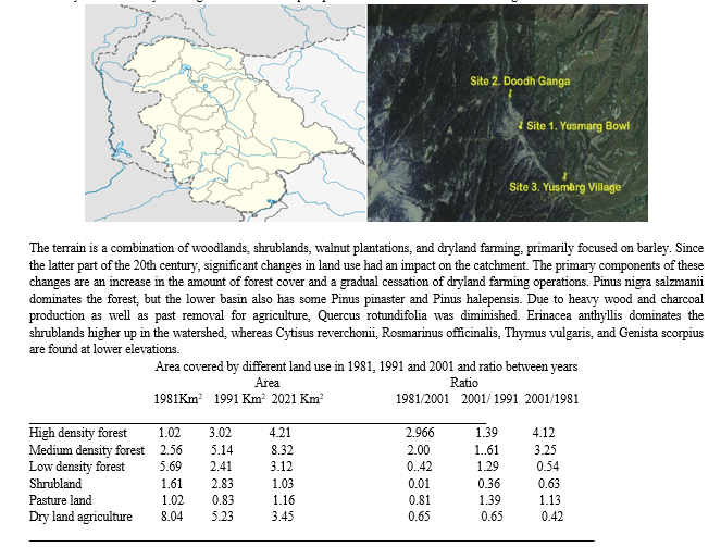 Reforestation and the cessation of agricultural activity have resulted in significant changes to land use in several parts of Jammu and Kashmir. on parallel, the Administration invests a significant amount of money on hydrological control projects to lessen silt transport and erosion. Nevertheless, it is still unknown how these significant changes in land use will impact catchment-scale erosion processes and whether effective hydrological control will lessen the export of silt. To assess the effects of land use scenarios with and without sediment control facilities (check-dams) on sediment yield at the catchment scale, a combination of field work, mapping, and modeling was employed. The study catchment is in Kashmir, where there have been significant changes in land use that have resulted in a decrease in agricultural area and an increase in forest cover. In addition, as part of the related reforestation efforts, numerous check-dams were built in the watershed. Applying the erosion model WATEM-SEDEM, six land use scenarios—each with and without check-dams—were used. Upon calibration, the model yielded an absolute sediment yield model efficiency of 0Ð84. The implementation of the model demonstrated that the changes in land use led to a steady decline in sediment output in a scenario without check dams. About 69% of the sediment production was retained behind check dams in a situation where there were no changes to land use. Although their effects on sediment control are transient, check-dams can be effective techniques. They have significant adverse effects, like downstream channel erosion. Changes in land use can have significant long-term effects on sediment output, even though they can also have negative effects. The goal of management and the unique environmental circumstances of each location determine whether to apply check dams or land use changes, such as reforestation, to regulate sediment yield.