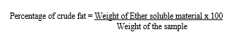 6. Fat: After carefully weighed the sample approximately 4-10gm transferred it to an extraction thimble.For around 6 hours on a sand bath, kept the thimble in a Soxhlet extractor with a electric heater. The extraction was said to be complete when a drop of petrol or ether taken from the drippings of the extractor did not produce any greasy stain on a filter paper. Removed the thimble and heated so that the extractor filled up about two third with petrol, leaving only a small quantity of the petrol in the flask. Then stopped heating and removed the flask from the apparatus. Filtered the residual petrol having fat in solution using Whatmann No. 40 and collected the filtrate in the already weighed small beaker or a glass dish. Washed the flask as well as filter paper many times with redistilled petrol until a drop of the filtrate did not give greasy spot on the filter paper. Evaporated petrol in the dish very carefully and calculated the weight of the residue to constant weight. The amount of crude fat or ether extract would be calculated by increased weight of the dish.