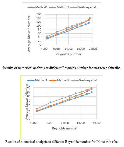 There was a decent agreement when numerical outputs were compared with the experimental ones existing in the literature. Excellent matching between Nusselt numbers calculated using method 2 and the existing ones was observed for square ribs but good agreement was found in case of thin ribs.