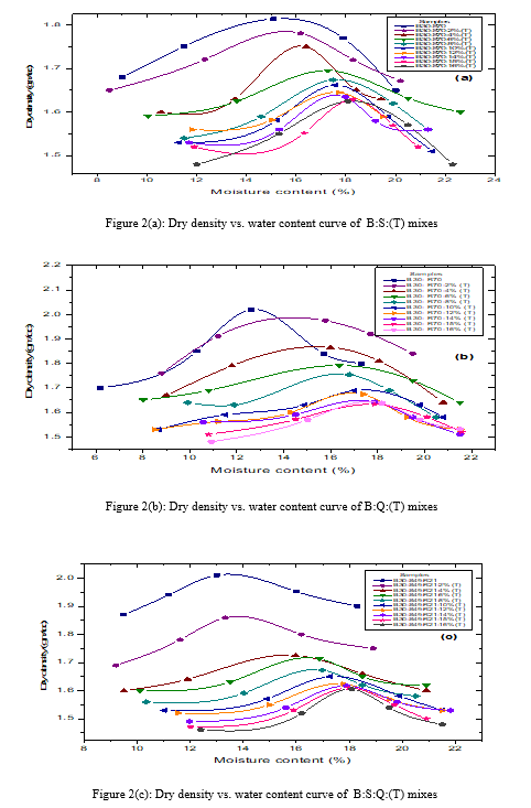 According to the test results, the MDD of all the mixes reduces as the tire dust content increases; however, the OMC increased as the tire dust proportions increase. As revealed in Table 2(a), (b), (c), before adding tire dust, the MDD of the B30:S70, B30:R70, and B30:S49:R21 mixes was 1.82, 2.02, and 2.025 gm/cc, respectively, which drops to 1.63, 1.643, and 1.61 gm/cc after adding T = 16%. This is due to the average unit weight of the B30:S70, B30:R70, or B30:S49:R21 mix per unit volume being reduced. The OMC of the mixes, on the other hand, increased from 15.10 to 18.10 % for B30:S70 mixes, 12.60 to 18.20 % for B30:Q70 mixes, and 13.00 to 18.10 % for B30:S49:R21 mixes after adding T=16%. This is mostly due to the fiber's increased surface area, which increases the required amount of moisture for the composite materials to become workable under load. However, Kalkan (2013) found, that both MDD and OMC get reduced when tire rubber fibre was added. Tire rubber fibres have a low density and a high specific surface area, resulting in these reductions.