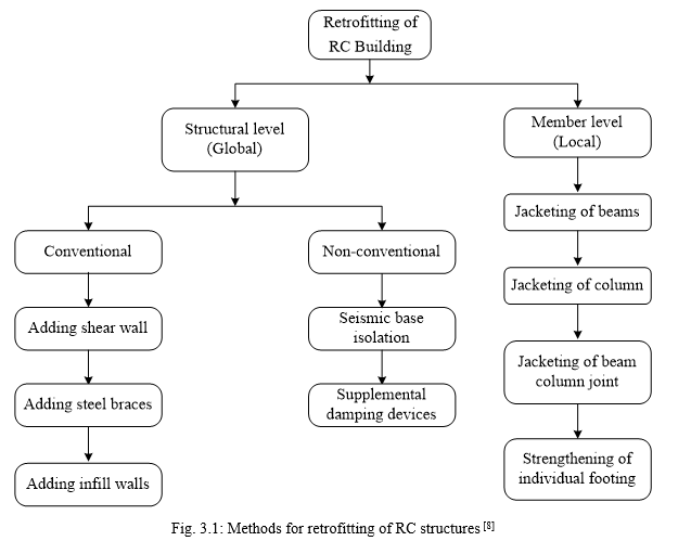 The general methods adopted for retrofitting of RC building are shown Fig. 3.1. As that current study, by Xilin Lu [8], is more focused with local level retrofit, a couple of the approaches employed for the same are addressed below.