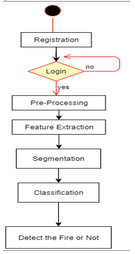 In this diagram we can see how data is used in each step first it take as input then some preprossecing activity is done on it then after we apply CNN algorithm on that data. after that we can detect fire using this data in this process data can be converted into different format like video to frame.