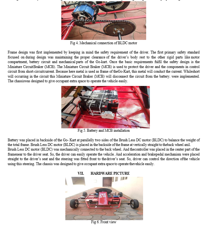 The wheelbase and track width of the vehicle are chosen accordingly. The front track width is minimized to reduce the turning radius of the vehicle and to increase the efficiency. Motor, the heart of the electric vehicle was selected and installed in such a way that it can perform well for an extended run time. BLDC motor was selected in this case. Speed control of the kart was done using a Motor controller.