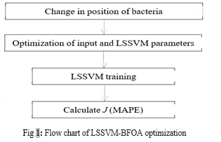 Theories regarding the main predictive tool, namely LSSVM, and BFOA as optimization algorithm are discussed in this section. Electricity price, as illustrated in [25], are highly volatile compared to the load series. Therefore, choosing the right feature affects the efficiency and accuracy of predictions. However, only publicly available data can be used for this purpose. The important input features for the prediction of electricity prices are selected as in [26]. It was found that many existing models of day-ahead electricity price forecast in Ontario were tested on year 2004 [7], [13], [27]– [29]. The analysis of price volatility for each testing period is performed in Section 4.1. Volatility analysis measures the price fluctuation of the test periods. Hence, the price behavior of the test periods should correspond to the volatility index measured. The final day-ahead forecast methodology is presented where LSSVM forecast engine is optimized by BFOA. A. SVM and LSSVM SVM could minimize over-fitting and local minima issues [30], and manage high-dimensional input space well. However, SVM involves high computation. The Least Squares Support Vector Machine (LSSVM) was therefore introduced to decrease the SVM computing load. LSSVM solves a linear equation system over quadratic programming problem (QP) which improves computation speed [31][31][34]. The Karush-Kuhn-Tucker (KKT) linear system is easier than the QP system. LSSVM even retains SVM capabilities that have a great generalization. B. BFOA E.coli bacteria living in the men gut have a unique food search activity. BFOA mimics this mechanism through four main processes; namely chemotaxis, swarming, reproduction, and elimination-dispersal. During chemotaxis, bacteria tumble or swim while avoiding dangerous places. They can also associate with other bacteria by sending attractive signals; or move individually by sending repellent signal. The objective function of each position of bacterium i is depicted by J. During the swarming step, the bacteria that have found the location of the nutrient may trigger nearby bacteria to create a herd. The notation for the objective function during the swarming process is the cell-to-cell attraction and repellent (Jcc). This will be added to the existing objective function, that will ultimately lessening the most recent objective function. Once nutrient is adequate and the environment is at a good temperature, the healthiest bacteria will grow in size and divide in the center to create their own duplication. This will contribute to future generations, while the most unhealthy bacteria will die. This process is referred to as reproduction. BFOA replicates this concept by sorting out the best MAPE in increasing order and retaining half of the total population for reproduction, while the other half will be destroyed.