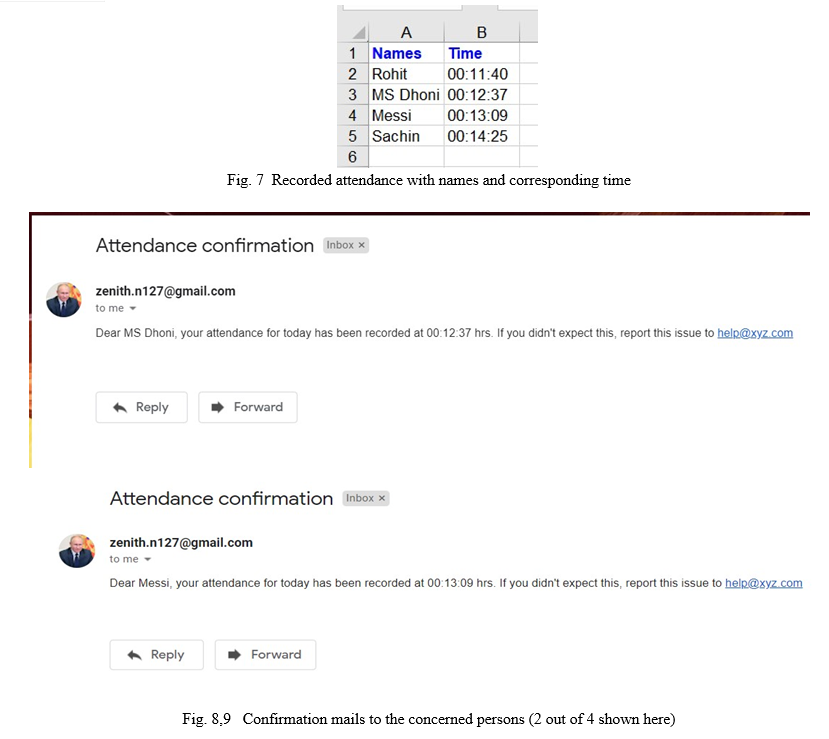 An attendance confirmation mail is sent to the corresponding email address featuring the name and time. The ‘q’ key of the keyboard is used to close the camera, which eventually completes the run and closes the program.