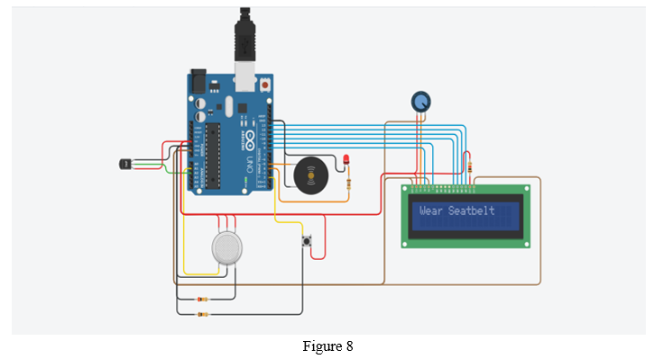 When the system is switched on the first warning of wearing a seatbelt is showcased. Unless the driver wears a seatbelt the buzzer and the LED stay on as shown in figure 8. The wearing of seatbelt action is replicated by pushing the button of pushbutton.