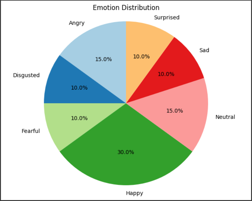 Visualization of predicted emotion distribution in a pie chart for emotion_dict is a function to map numerical labels (0 to 6) to specific emotion, for example, "Angry," "Happy," "Sad," etc. predicted_emotions is a list of predicted emotion for a collection of samples (e.g., songs). It then lists occurrences of each emotion in predicted_emotions in a list comprehension. It then plots a pie chart representing distribution of predicted emotion using matplotlib with labels for emotion name and distribution in terms of percentage displayed using autopct='%1.1f%'. plt.axis('equal') is used to make a circle out of the pie chart, and plt.show() to plot it. This visualization helps in simply estimating how frequently a certain emotion occurs in prediction.
