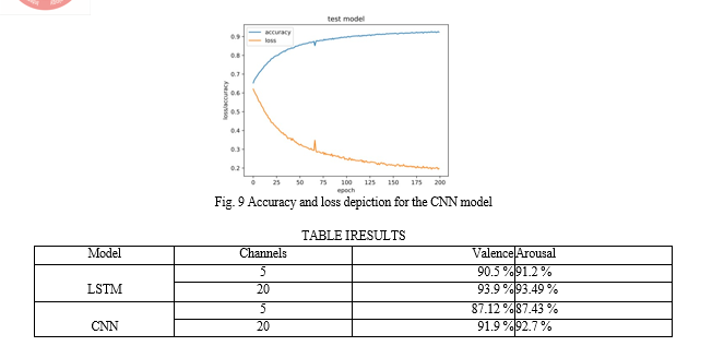11. Choi et al. used EEG signals from the DEAP dataset to train the LSTM model, enabling the classification of arousal and valence levels associated with mental states. The LSTM architecture enables the model to capture temporal dependencies in the EEG signals, facilitating accurate classification of emotional states in which the achieved valence and arousal accuracies are 78% and 74.65%, respectively.