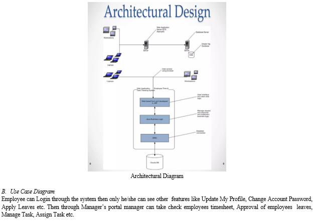 Architectural design consists of Workstations, Laptops, Web Application Servers, Database Server, etc. We are using some applications such as: 1. Web based front end development in JSP for user interface and client-side logic. 2. Java Business Logic for manage request and response and implement for logic. 3. JDBC for establishing the connection. And lastly, all these applications are connected to Oracle Data Base.
