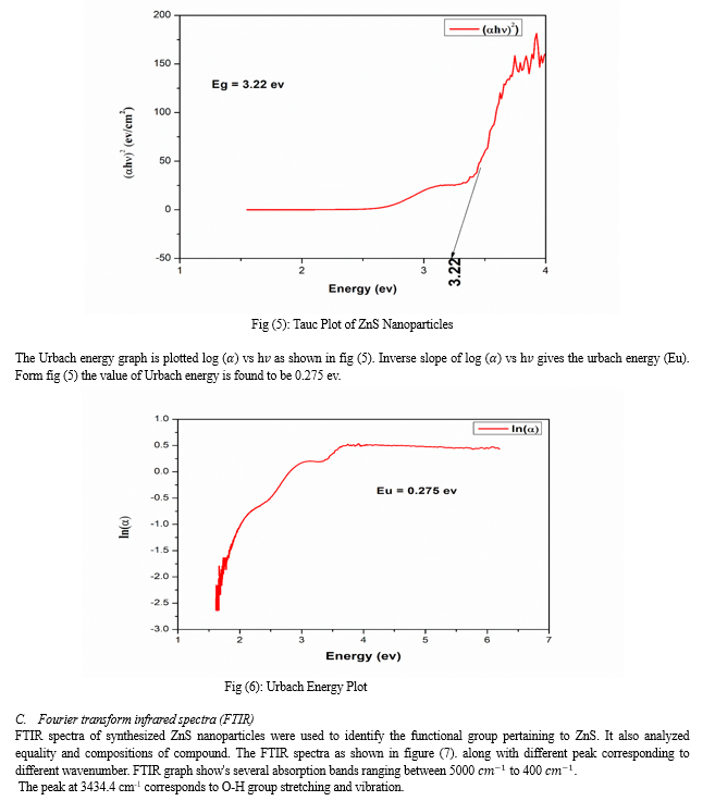 ZnS Nanoparticles have been synthesis by using co-precipitation method and were characterised by XRD, UV and FTIR analysis . XRD confirmed the cubic crystal structure with particle size 2.90 nm and having maximum intensity peak for (111) plane located at 2? = 28.9. UV-Vis spectroscopy revealed that the band gap energy of the ZnS nanoparticles is 3.22 eV, and the Urbach energy is 0.275 eV also FTIR analysis confirmed the presence of ZnS at peak wavelength 3434.4 nm.