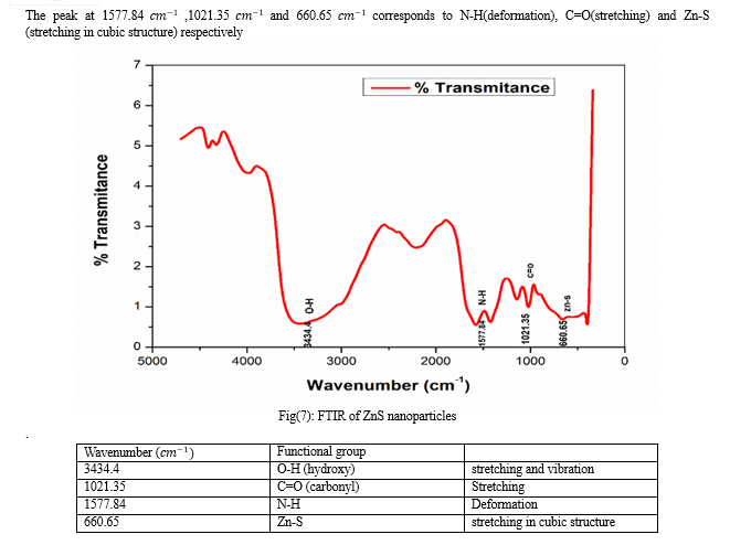 Nanoparticles are tiny materials having size range from 1 to 100 nm. They can be classified into different classes based on their properties shape or sizes. The nanoparticles show enhanced properties such as highly reactivity, strength, surface area, sensitivity, stability etc. because of their small size[1][6].Crystal structure of ZnS nanoparticles can vary depending on the size shape and synthesis method used. However, the most common crystal structure of ZnS nanoparticles is the zinc blende structure which is cubic crystal structures with zinc ions occupying half of the tetrahedral and sulfur ions occupying the other half. This structure is characterized by a closed - packed arrangement of atoms with a high degree of symmetry other possible crystal structure of ZnS nanoparticles include Wurtzite and rock salt structures, depending on the specific conditions of synthesis[6][8].