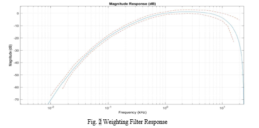 A special filter used in measuring loudness levels, and consequently carried over into audio noise measurements of equipment. Weighting filters are a special type of band-limiting filters designed to correspond to the way we hear or some other specific criteria.[8] The A-weighting curve has been widely adopted for environmental noise measurement and is standard in many sound level meters. [9] A-weighting is also frequently used to evaluate potential hearing impairment brought on by loud noise, but this use appears to be based more on the availability of sound level meters that incorporate A-Weighting than on any solid experimental data to support it. This filter incorporates the "A" frequency weighting, the fig. 2 represents the frequency response of filter, strategically chosen to optimize its noise reduction capabilities for the targeted application.