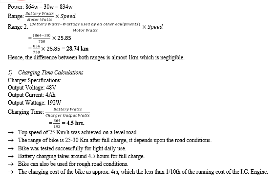 We would like to conclude this Report by saying that we had successfully made an electric vehicle which is affordable to everyone, also as compared to IC Engine the running cost of our bike is as low as almost 1/10th. Our E-Bike has been fabricated and tested successfully, different parameters like running range, cost per kilometre, discharge time of battery has been measured with actual running condition and it delivered better results. The ultimate goal of this project has been achieved.