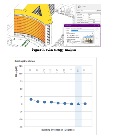 To enhance the utilization of solar radiation for renewable energy generation and curtail energy consumption, the orientation of the building has been fine-tuned. Although a southern orientation was initially deemed as the best, further studies revealed that an eastward shift of 57 degrees from the south (fig. 4), corresponding to 123 degrees from the north, would yield the highest energy output. By making this adjustment, the building is expected to generate a remarkable 1379.9 MWh/year (table 2).