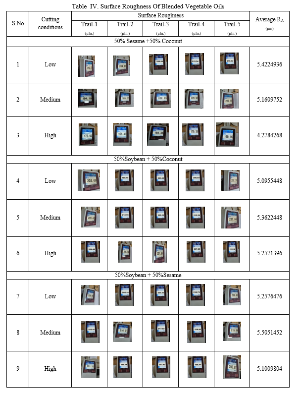 From the table V it was observed that chips produced for the blend 50% Sesame + 50% Coconut oil at low cutting condition is very long ribbon coiled chips (continuous chips) due to continuous plastic deformation and it was observed inside part of the chip shows steps due to intermittent slip and outside is smooth, where as for medium cutting condition shorter coiled chips are formed for higher cutting conditions Serrated Chips (semi-continuous) are generated which posses a saw tooth profile due to the alternating high shear strain followed by a low shear strain. It is clearly observed that effectiveness of MQL is suitable for the blend of 50% Sesame + 50% Coconut oil.