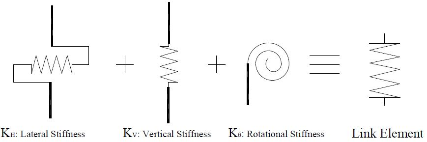 Figure 1 shown above is the analysis method to perform the elastomeric bearing simulation known as link element analysis, consist of lateral stiffness, vertical stiffness and rotational stiffness. Link element analysis allows for a more accurate representation of the load paths in elastomeric bearings by accounting for specific points of force transfer that are crucial for realistic load distribution in the model. By integrating this analysis into FEM, it refines the load behaviour simulation, leading to more precise predictions of performance under various loading conditions.